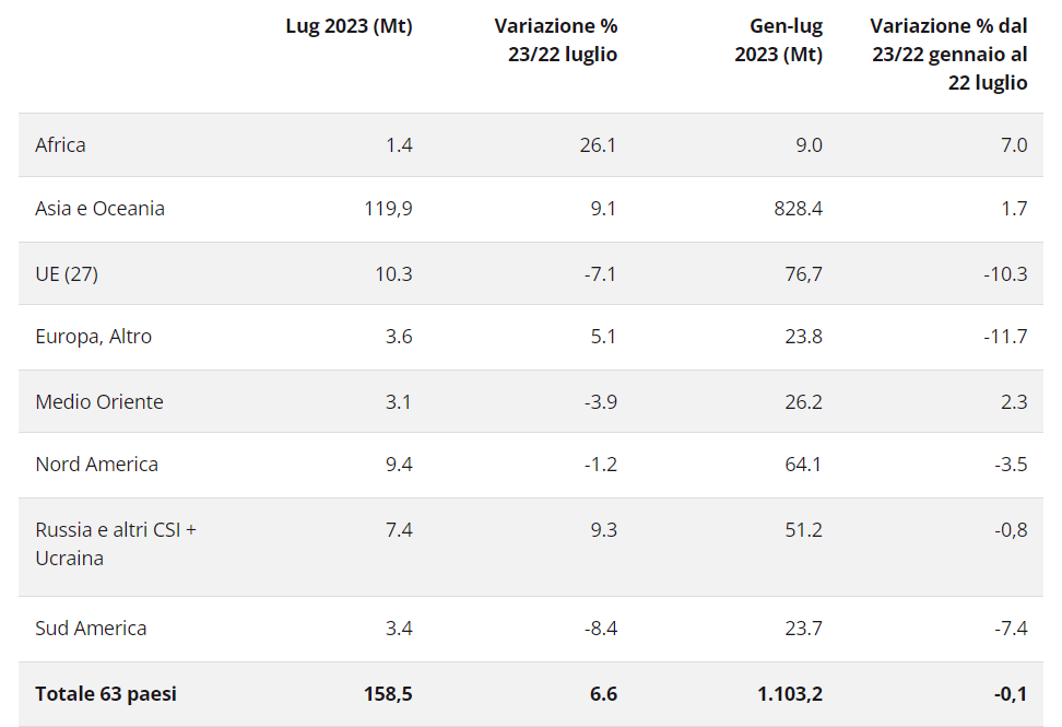 - L’Africa ha prodotto 1,4 Mt nel luglio 2023, in aumento del 26,1% rispetto a luglio 2022.