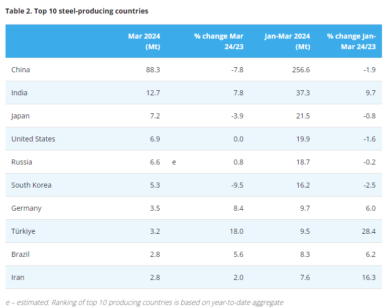La Cina, il più grande produttore di acciaio, ha prodotto 88,3 milioni di tonnellate a marzo, in calo del 7,8% rispetto a un anno fa, ma in aumento dell’8,7% su base mensile, rappresentando il 55% della produzione globale totale di acciaio grezzo.
