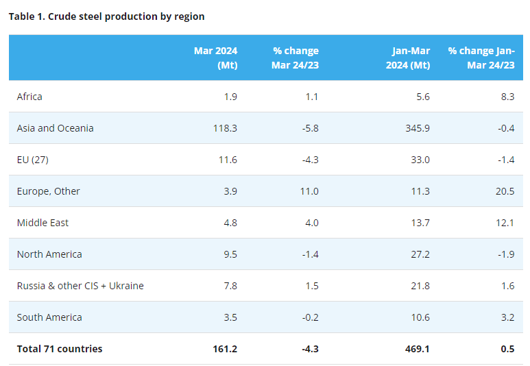 La produzione globale di acciaio grezzo è stata di 161,2 milioni di tonnellate a marzo, in calo del 4,3% su base annua, secondo i dati della World Steel Association pubblicati recentemente.